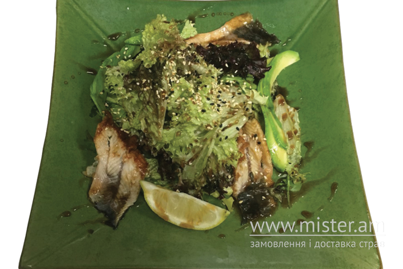 Вугор, мікс салатів, авокадо, соус унагі, водорості хіяші вакаме, кунжут, лимон.