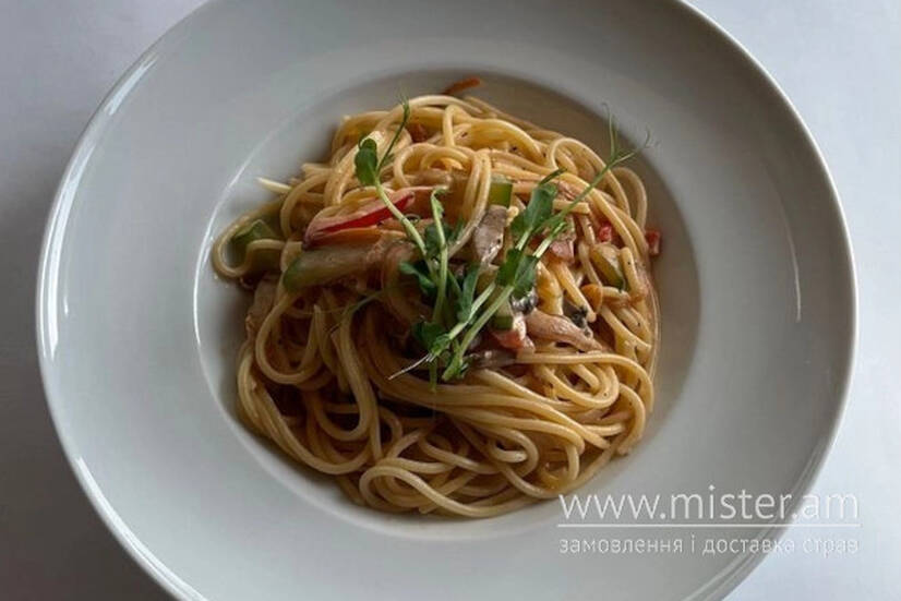 Спагеті, морква, печериці, перець болгарський, вершки, сир пармезан, соус томатний, баклажан, цукіні, броколі, синя цибуля, квасоля стручкова.