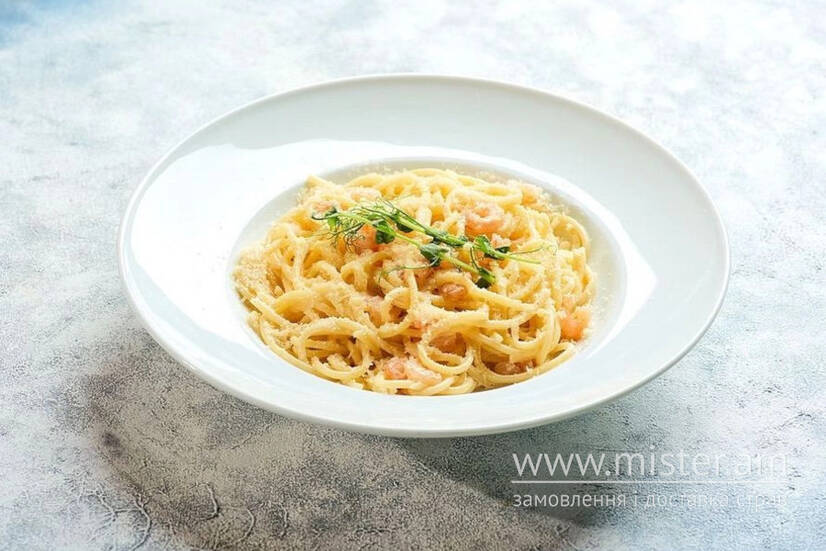 Креветки коктейльні, спагетті, солодкий соус чилі, вершки, часник, вино, масло, сир пармезан, мікрогрін.