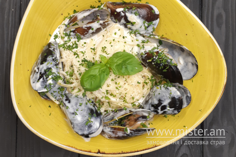 Спагеті, лосось, шпинат, вершки, сир пармезан, часник.