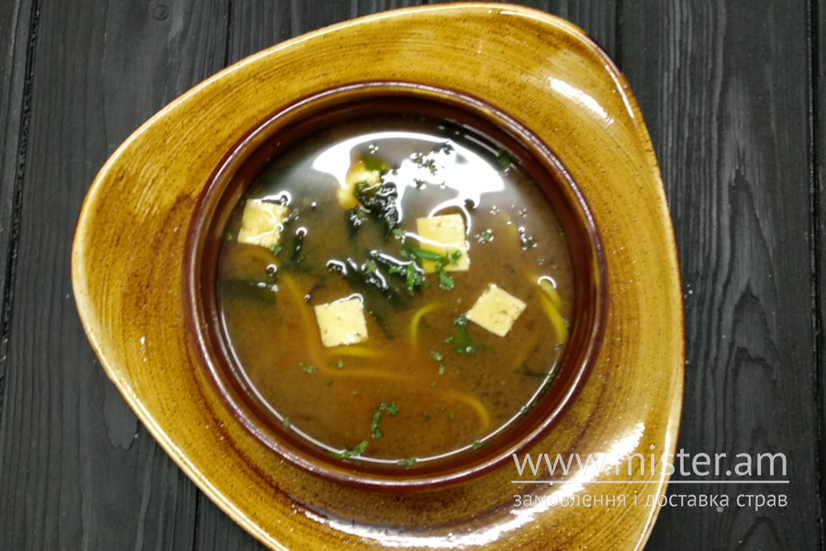 Бульйон Місо, локшина Рамен, сир Тофу, водорості вакаме, цибуля зелена, кінза.