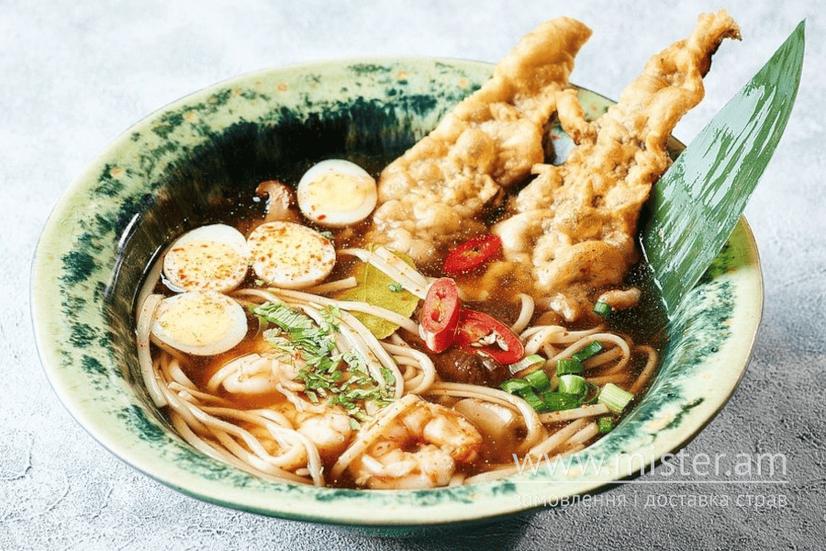 Бульйон рамен, локшина рамен, цибуля зелена, гриби шіїтаке, яйце перепелине, мікрогрін, водорості норі, перець чилі, галангал, лист кафіру.