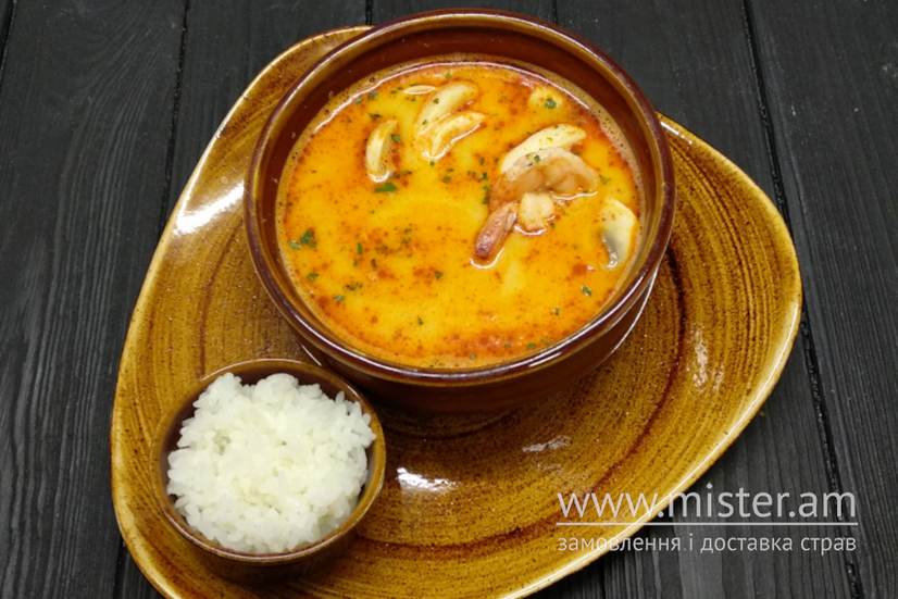 Мікс морепродуктів, паста Том Ям, кокосове молоко, печериці, рис, кінза, сік лимону.