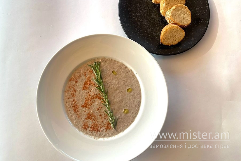 Печериці, вершки, спеції, цибуля, перець болгарський, соєвий соус, мускатний горіх, трюфельна олія.