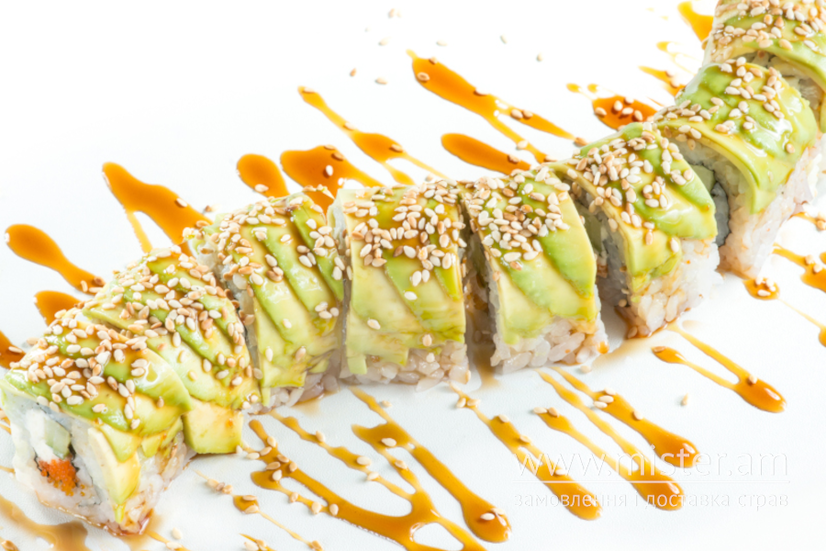 Сир вершковий, авокадо, огірок, ікра корюшки, кунжут, соус унагі.