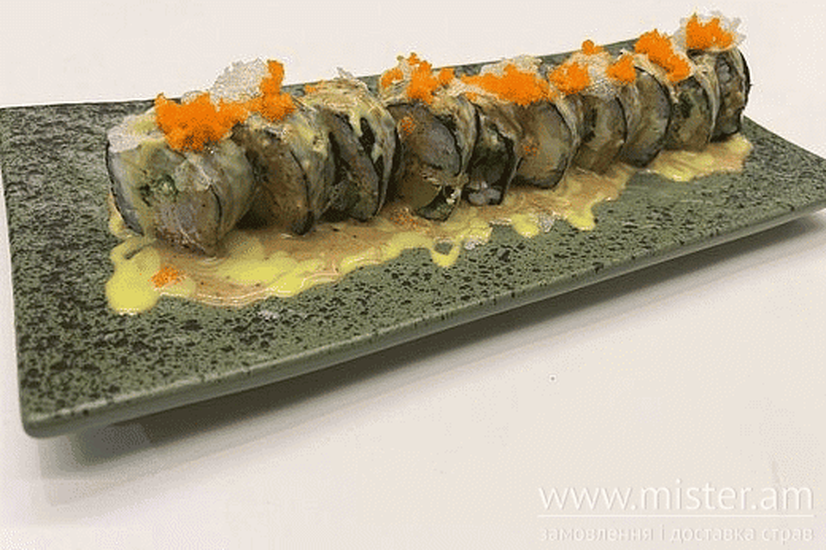 Креветка тигрова, сніжний краб, сир вершковий, водорості хіяші вакаме, авокадо, соус діп, соус кунжутний, майонез , ікра корюшки.