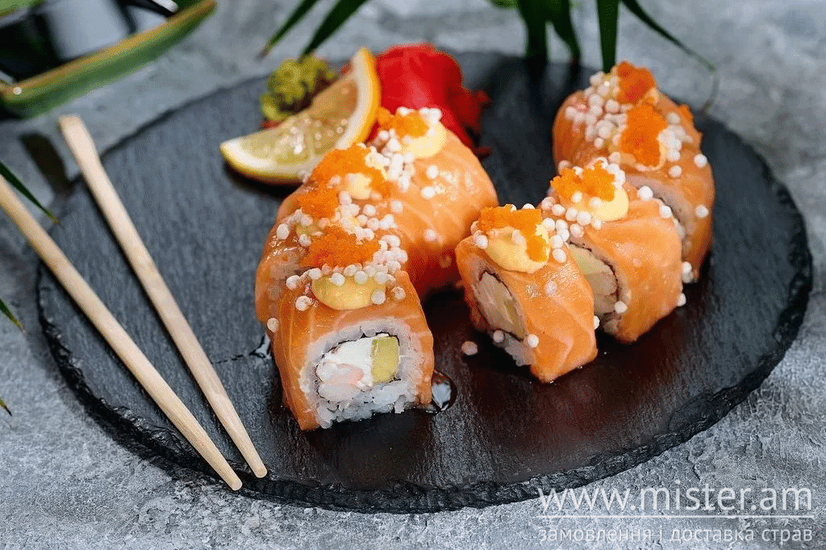 Норі, рис, кунжут, сир вершковий, авокадо, креветка варена, лосось, японський майонез, соус унагі, рисові кульки, ікра корюшки.