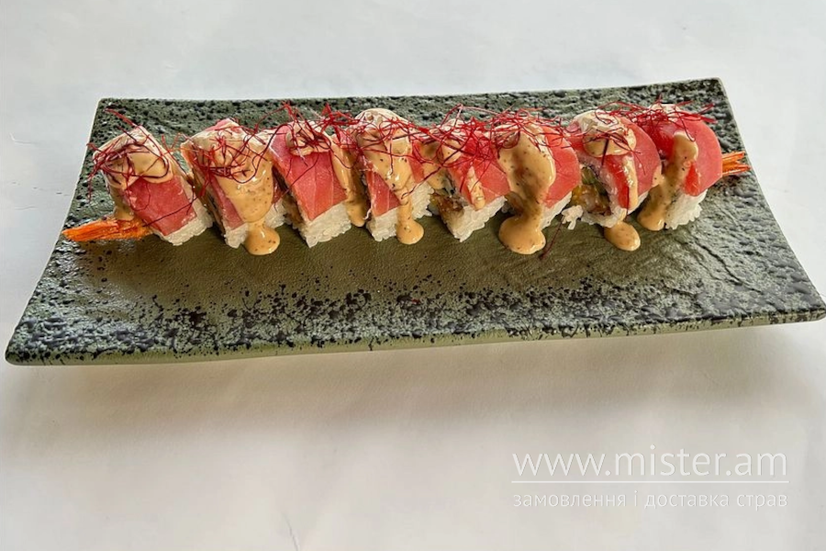 Рис, норі, сир для суші, огірок, дайкон, креветка панко, тунець, соус кунжутний, нитки чилі, імбир маринований, васабі, лимон.