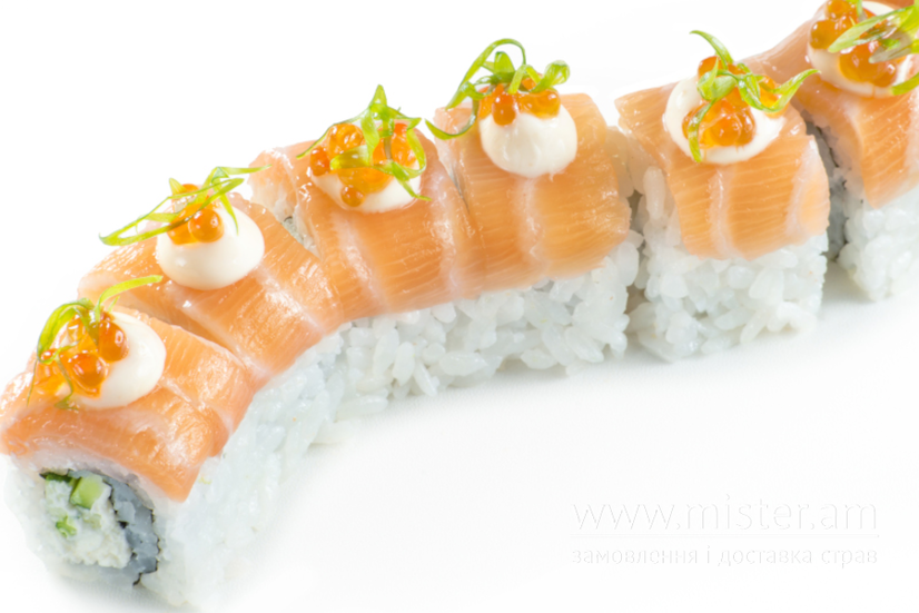 Лосось, сир вершковий, огірок, сніжний краб, соус лі, соус спайсі, ікра масаго, нитки чилі.