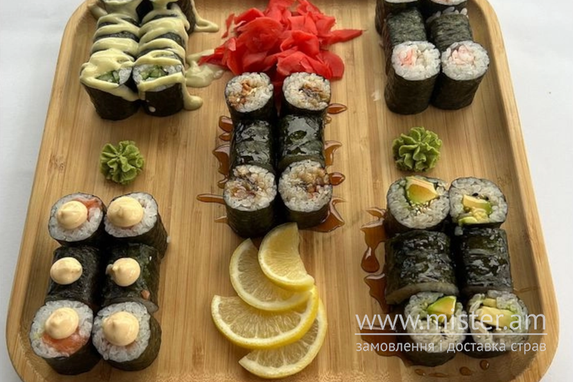 Хосомакі з авокадо, Хосомакі з вугрем, Хосомакі з лососем, Хосомакі з огірком, Хосомакі з креветкою.