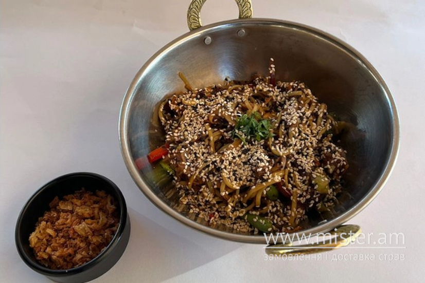 Качка рвана, соус хойсін, локшина рамен, морква, стручкова квасоля, печериці, перець болгарський, синя цибуля, баклажан, цукіні, броколі, імбир, цибуля кранч, часник, соєвий соус, кінза, кунжут.