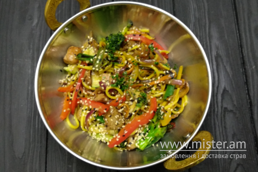 Курка, солодкий соус чилі, локшина рамен, морква, стручкова квасоля, печериці, перець болгарський, синя, цибуля, баклажан, цукіні, броколі, імбир, цибуля кранч, часник, соєвий соус, кінза, кунжут.