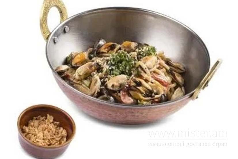 Мідії з локшиною Рамен у гостро-часниковому соусі