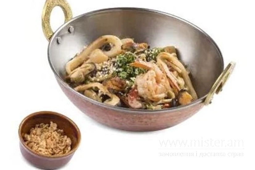 Мікс морепродуктів, соус теріякі, локшина рамен, морква, стручкова квасоля, печериці, перець болгарський, синя цибуля, баклажан, цукіні, броколі, імбир, цибуля кранч, часник, соєвий соус, кінза, кунжут.