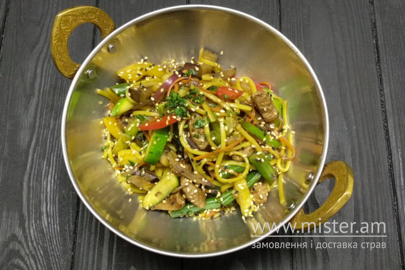 Телятина, гостро-часниковий соус, локшина рамен, морква, стручкова квасоля, печериці, перець болгарський, синя цибуля, баклажан, цукіні, броколі, імбир, цибуля кранч,часник, соєвий соус, кінза, кунжут.