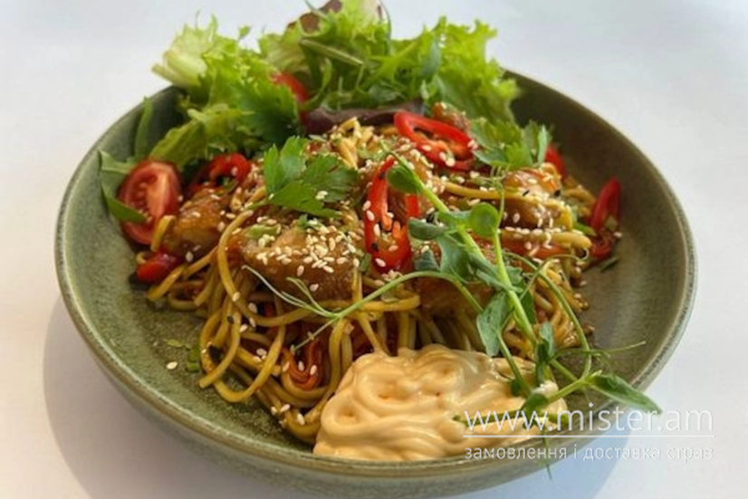 Мікс овочів, креветка в панко, яєчна локшина, перець гострий чилі, соус солодкий чилі, майонез гострий, мікс салатів, помідор чері, кінза, кунжут.