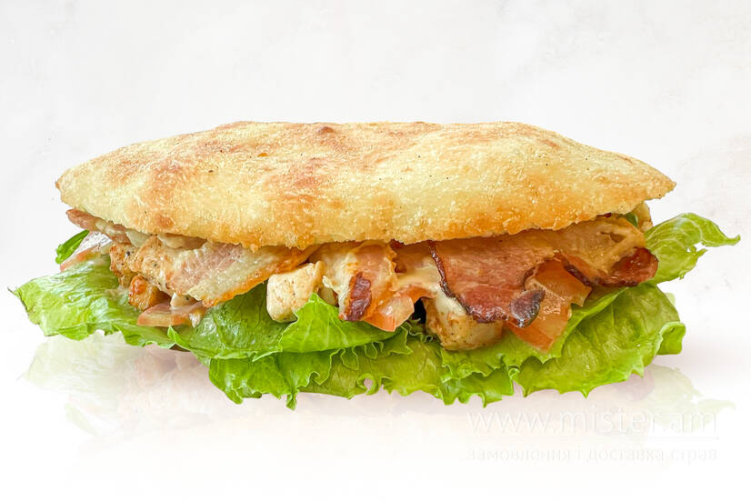 Піта, салат Айсберг, соус Цезар, курка маринована, бекон, помідор.
