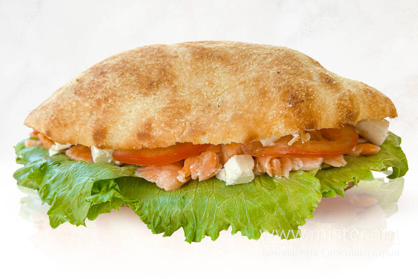 Піта, салат Айсберг, соус Цезар, лосось, помідор, сир фелата.