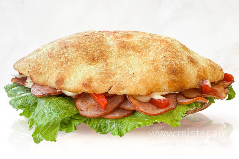 Піта, салат Айсберг, соус Цезар, шинка, перець болгарський, цибуля маринована.