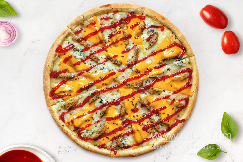 Свинина маринована, сир моцарела. сир дор блю, цибуля маринована, сир тостовий, льон, соус вершковий, соус з журавлини.