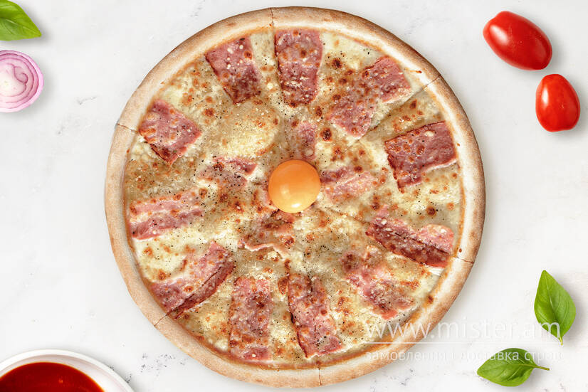 Соус вершковий, бекон, сир моцарела, жовток, сир пармезан, перець чорний молотий.
