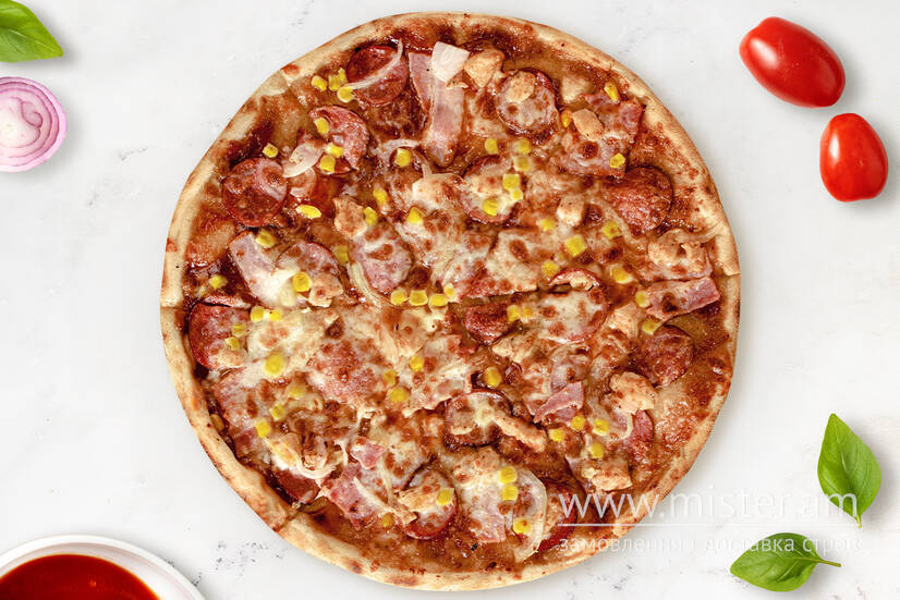 Соус BBQ, цибуля маринована, ковбаски баварські, курка маринована, бекон, сир моцарела, кукурудза, часникова олія.