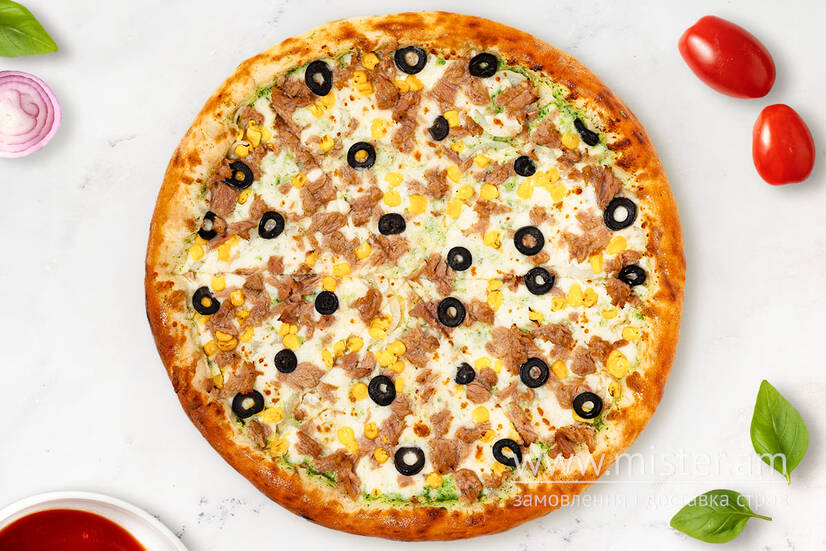 Соус вершково-шпинатний, цибуля маринована, сир моцарела, тунець, кукурудза, маслини, часникова олія.