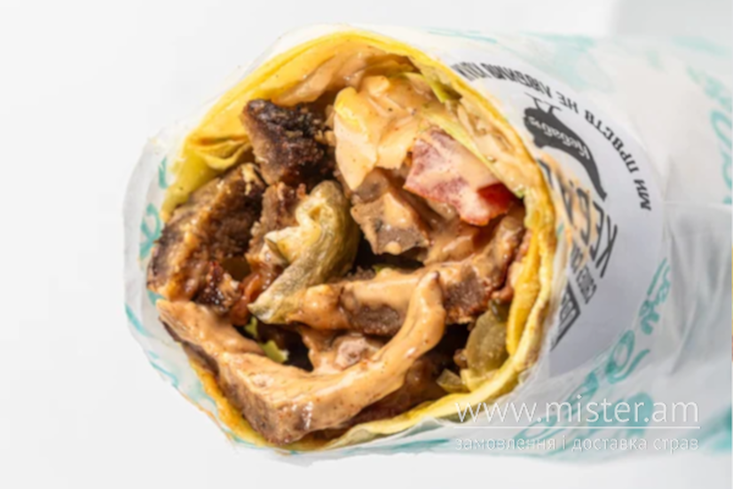 Цільнозерновий лаваш, молода телятина, фірмовий соус на йогуртовій основі, пекінська капуста, томати, квашені огірки, маринована цибуля, мікс зелені.