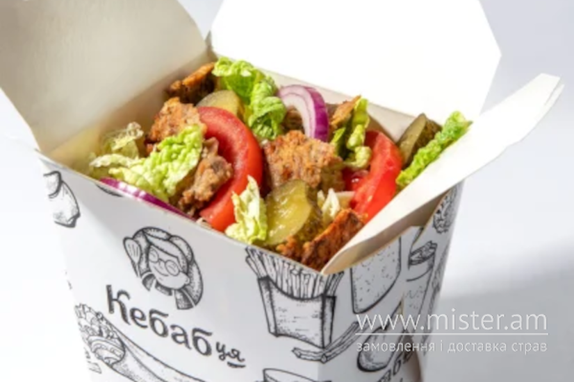 Бельгійська фрі, молода телятина, фірмовий соус на йогуртовій основі, пекінська капуста, томати, квашені огірки, маринована цибуля, мікс зелені.