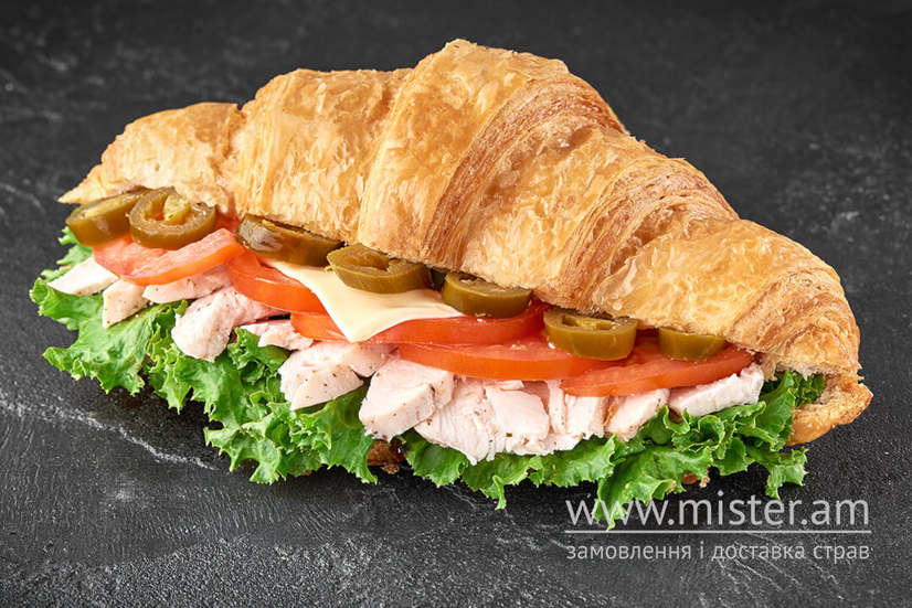 Круасан, курка, салат, огірок, імбир маринований, кунжут, соус теріякі.
