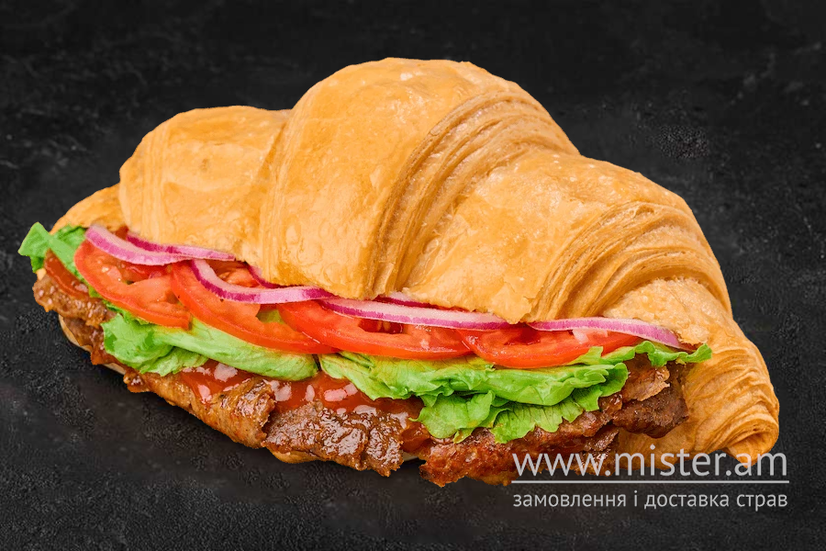 Круасан, яловичина гриль, салат Айсберг, помідор, маринована цибуля, соус Сацебелі, соус Класичний.