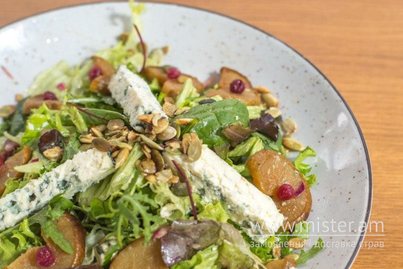 Мікс салатів, груша, сир дорблю, апельсиново-бальзамічна заправка.