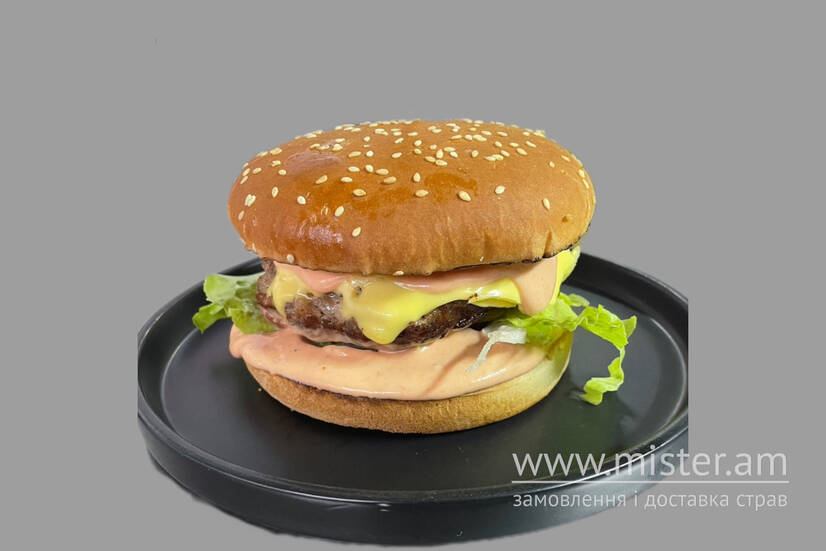 Телятина, сир чеддер, айзберг, помідор, огірок маринований, цибуля червона, соус.