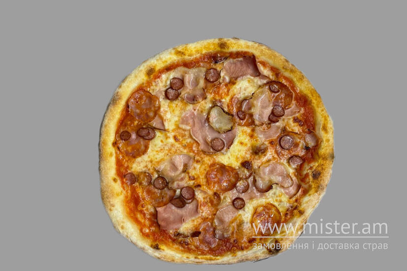 Томатний соус, моцарела, шинка, бекон, салямі, мисливські ковбаски.