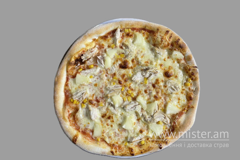 Томатний соус, моцарела, філе куряче, ананас, кукурудза.