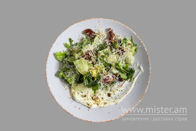 Вялені помідори, айсберг, рукола, вершковий сир, вирізка вялена, горіх грецький.