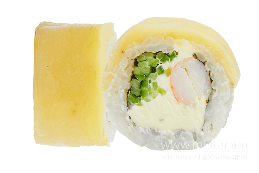 Рис, норі, оскопар копчений, огірок, крем-сир, креветка.