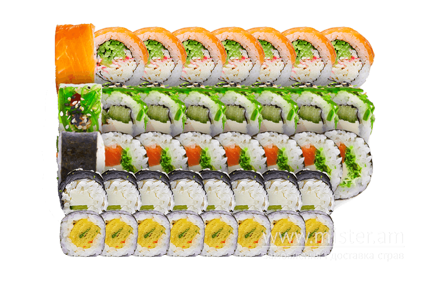 Філадельфія сніжний краб з огірком, рол чука креветка, футомакі лосось, макі філадельфія, макі омлет.