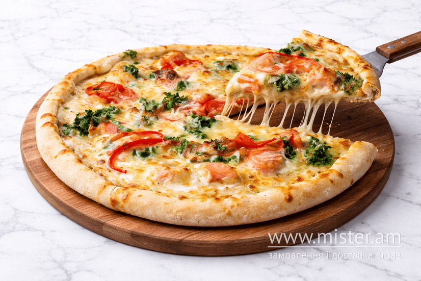 Вершковий соус, лосось слабосолений, шпинат, томати черрі, пармезан, моцарелла.