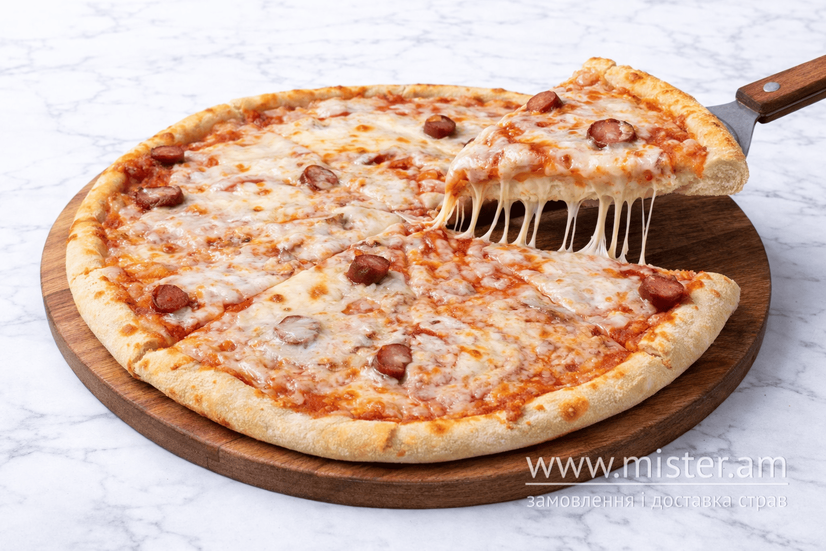 Томатний соус, ковбаски мисливські, шинка, печериці, томати, моцарела.