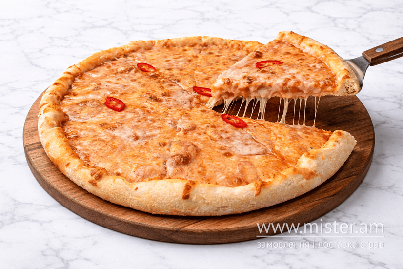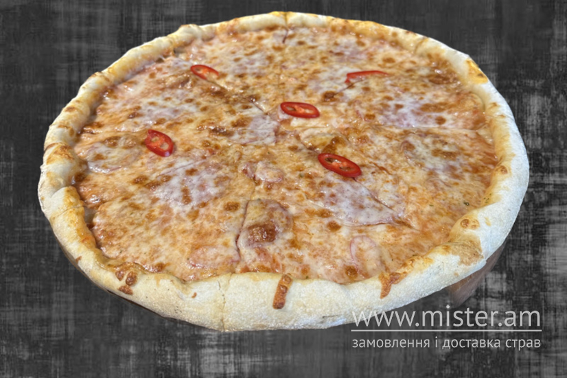 Томатний соус, салямі, перець болгарський, чилі, пепероні, моцарелла.