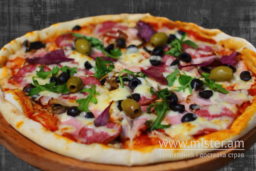 Томатний соус, бекон, шинка, салямі, печериці, маслини, моцарелла.