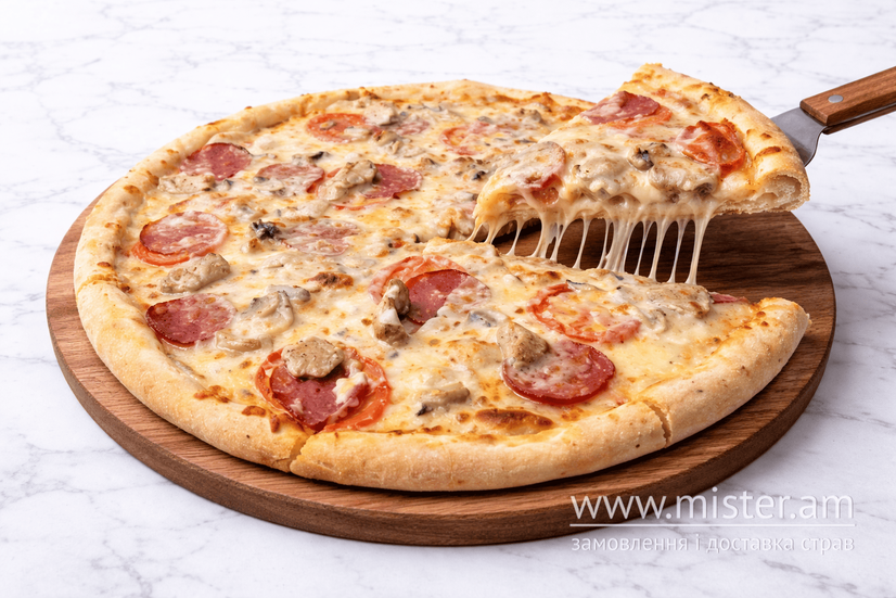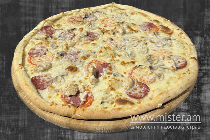 Вершковий соус, салямі, моцарелла, томати та печериці.