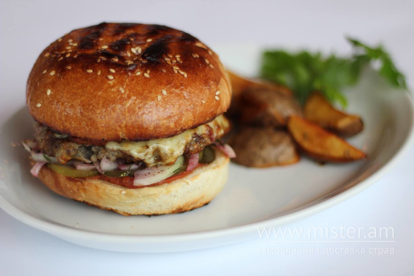 Хрумка булочка, імеритинський сир, котлета з пряної телятини, зелень, огірок, зерна гранату, цибуля, подається з картопляними діпами та соусом.