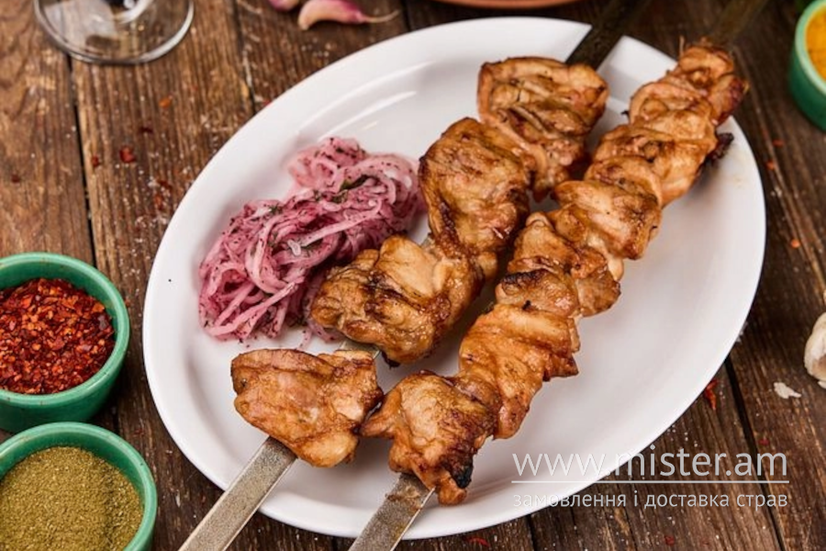 Шашлик з курячого філе. Подається з соусом та фірмовою цибулею.