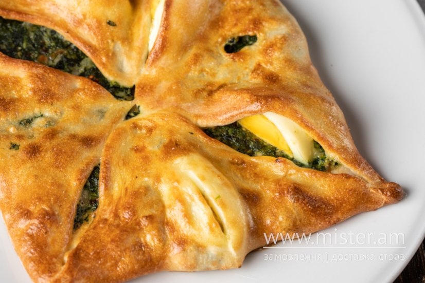 Паляниця з ніжним шпинатом, яйцем та часниковою заправкою.
