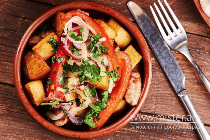 Соковита свинина, смажена з картоплею та овочами, заправлена часниковим соусом.