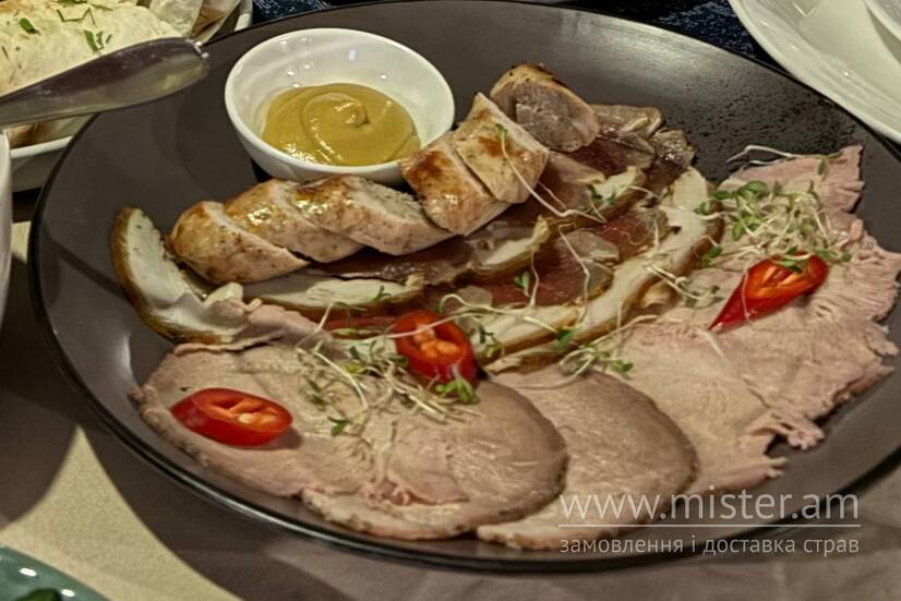 Буженина, печений підчеревок, домашня ковбаска зі свинини та гірчиця.