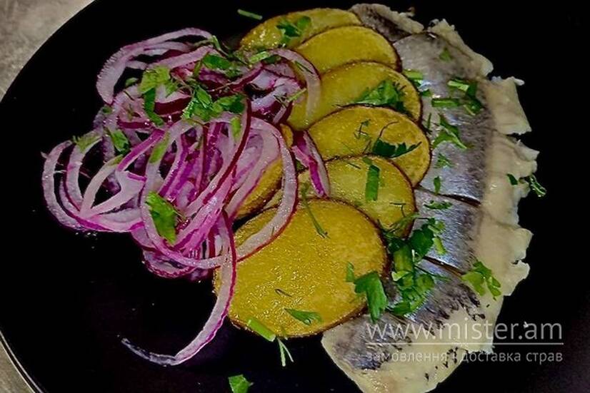 Оселедець слабої солі та маринована синя цибуля.