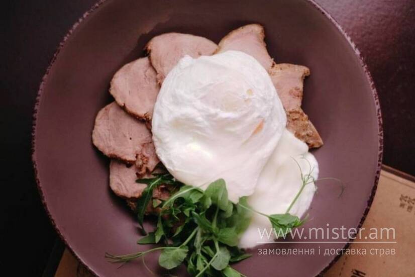 Картопляне ресті з бужениною власного виробництва, яйце пашот та сметана.